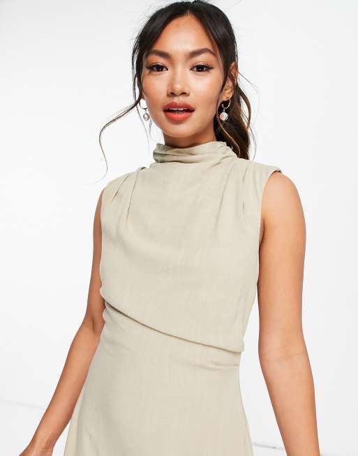 Asos Design Sleeveless Cowl Neck Midi Dress With Open Back In Linen In Neutral Asos